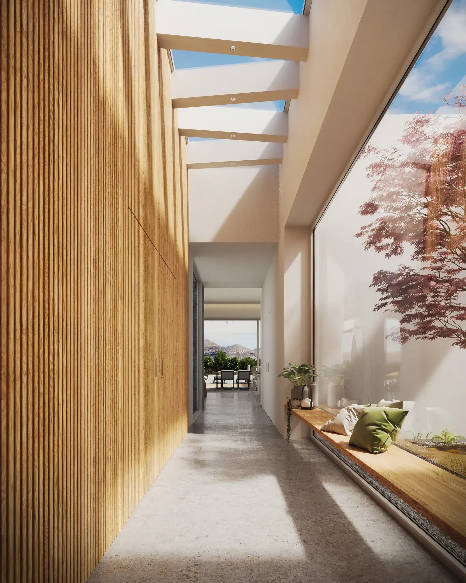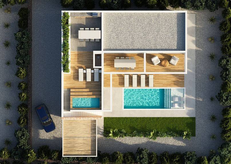 This 350m2 L-shaped, minimalist villa has a layout consisting of the following: The house is built around a main living-dining-kitchen space (open concept), completely open to the outside where there is a porch. There are also 3 en-suite bedrooms with private bathrooms, a laundry or pantry area and finally an exterior staircase that gives us access to the roof, which is walkable and can be used to develop a solarium + outdoor kitchen space to enjoy spectacular 360º views. The program is developed under the premise, “in continuous contact with the outside landscape.”